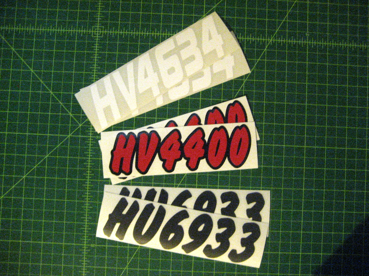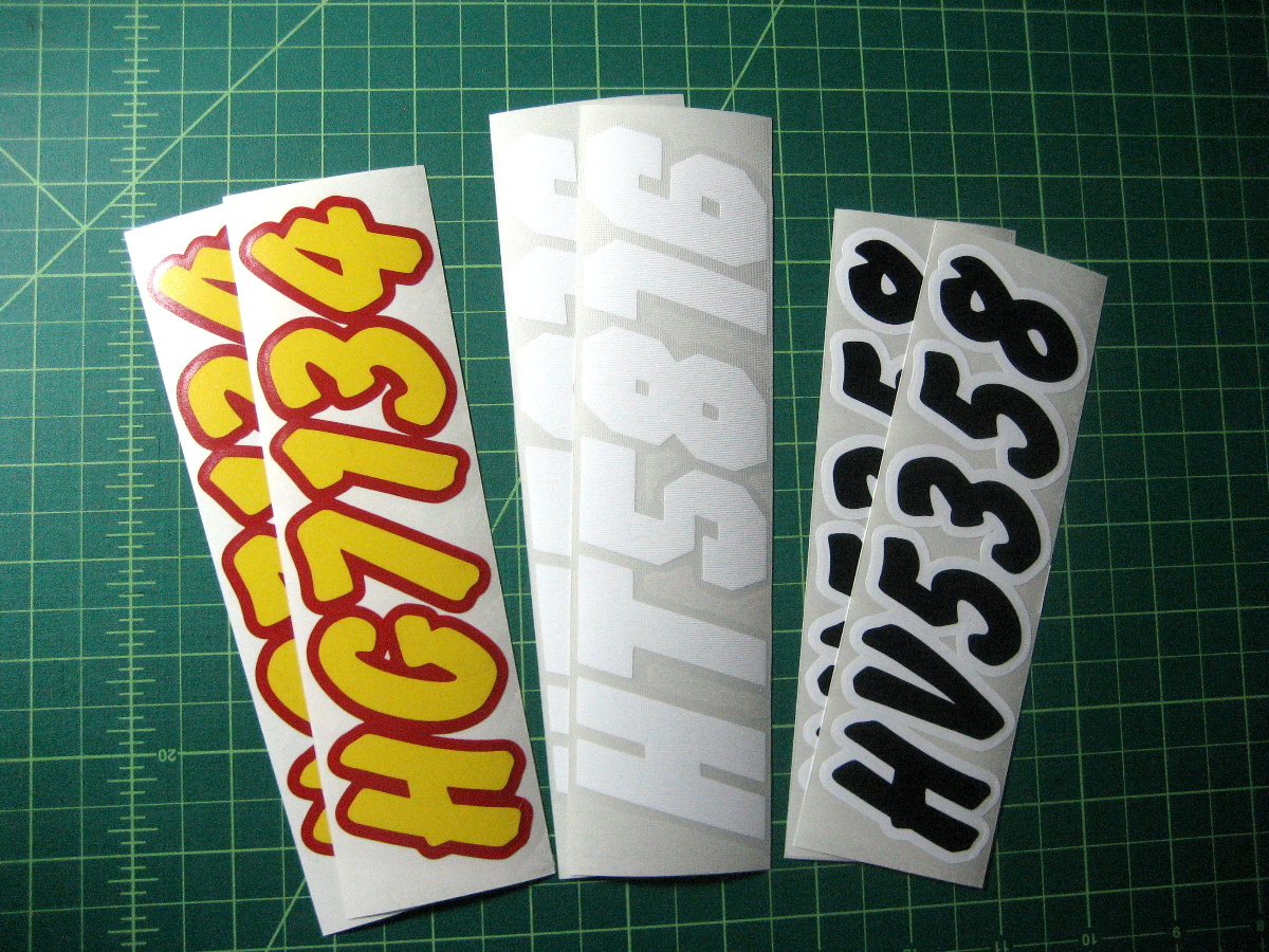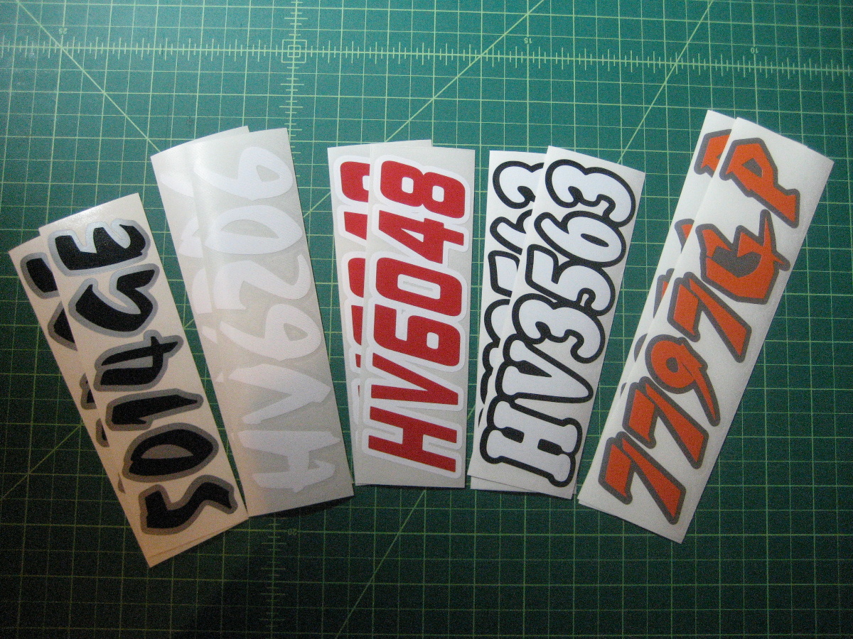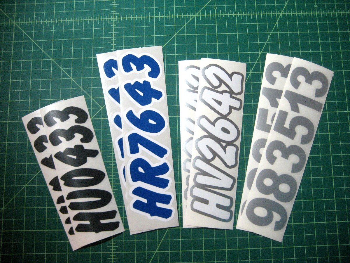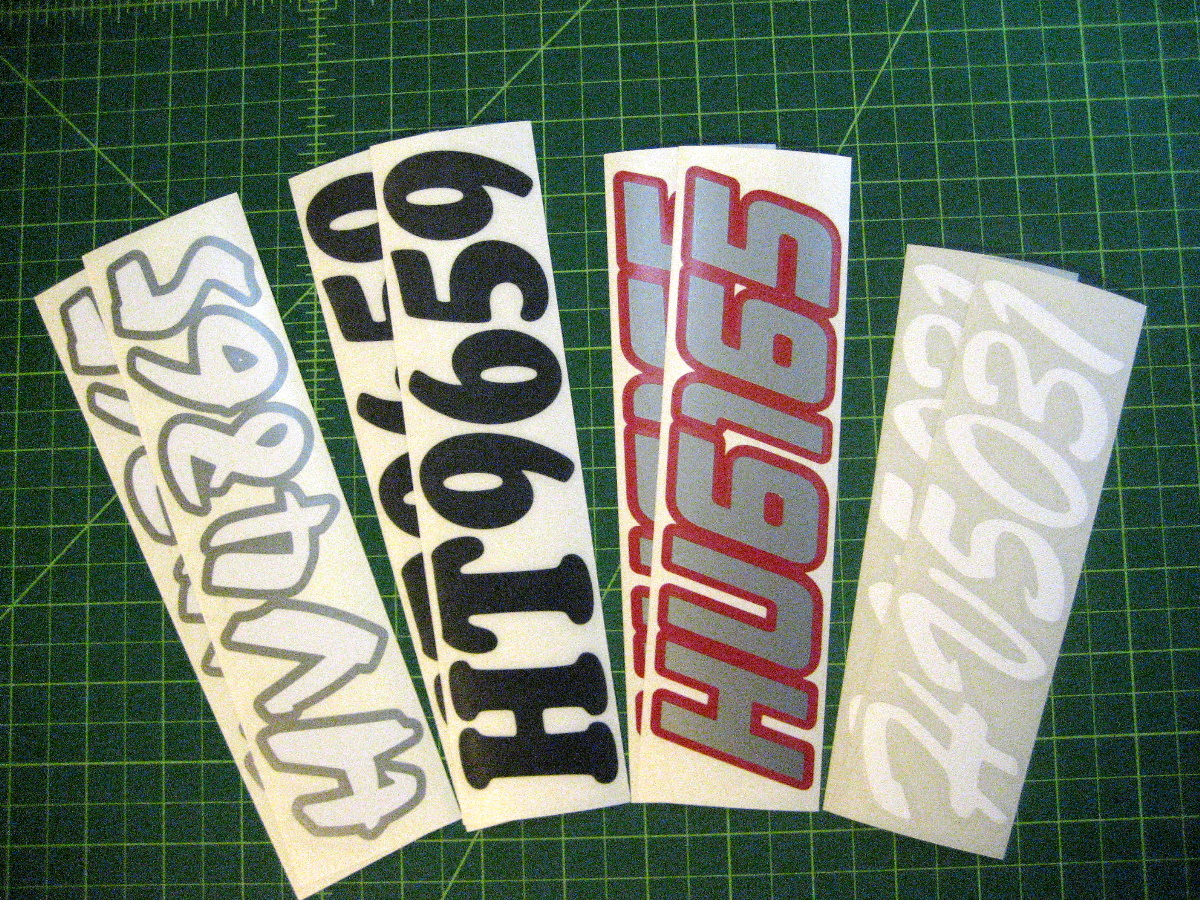 Just a few samples snowmobile registration numbers with and without outline options... (Note: the background color on some of the samples is for visual only)