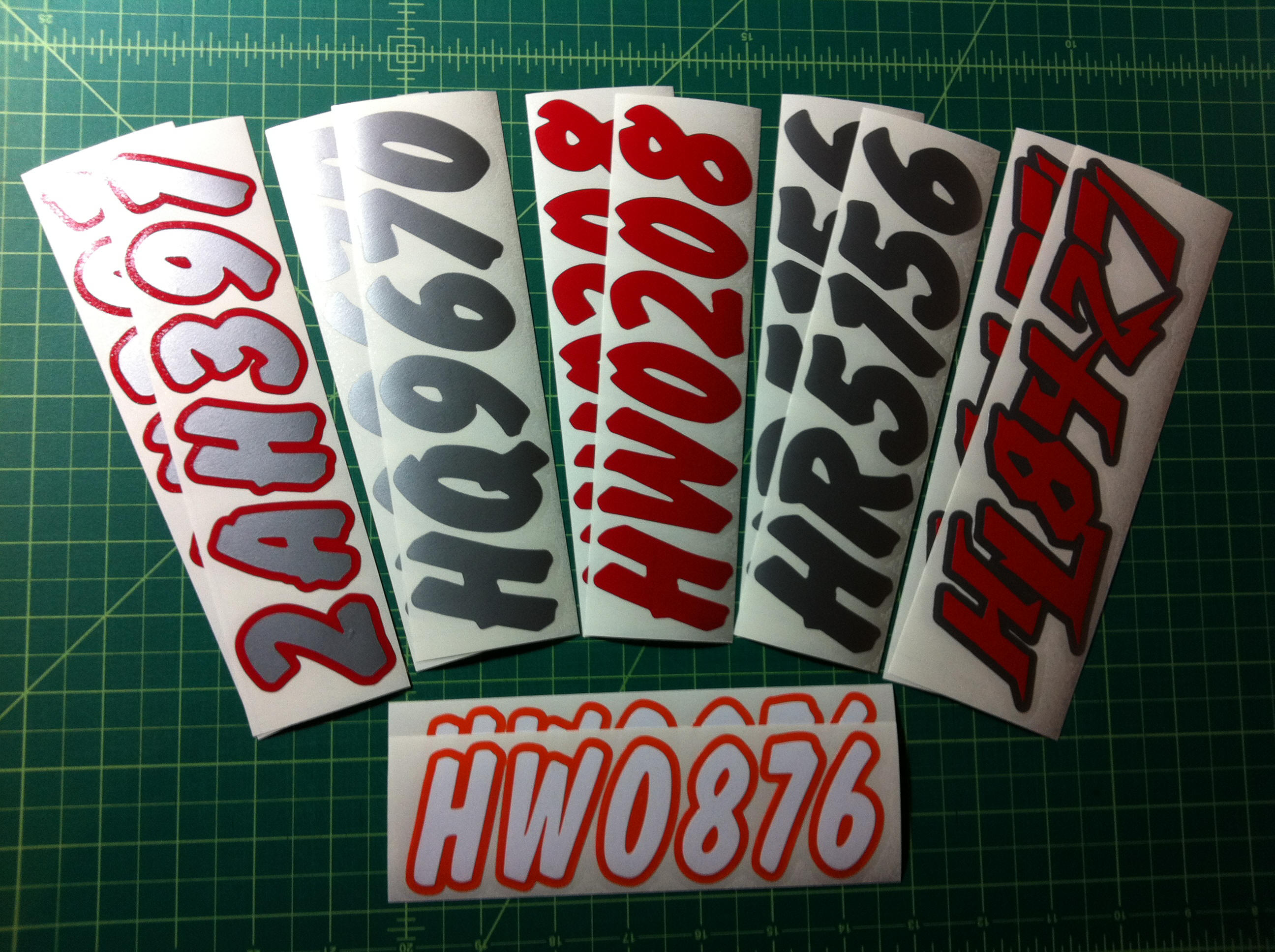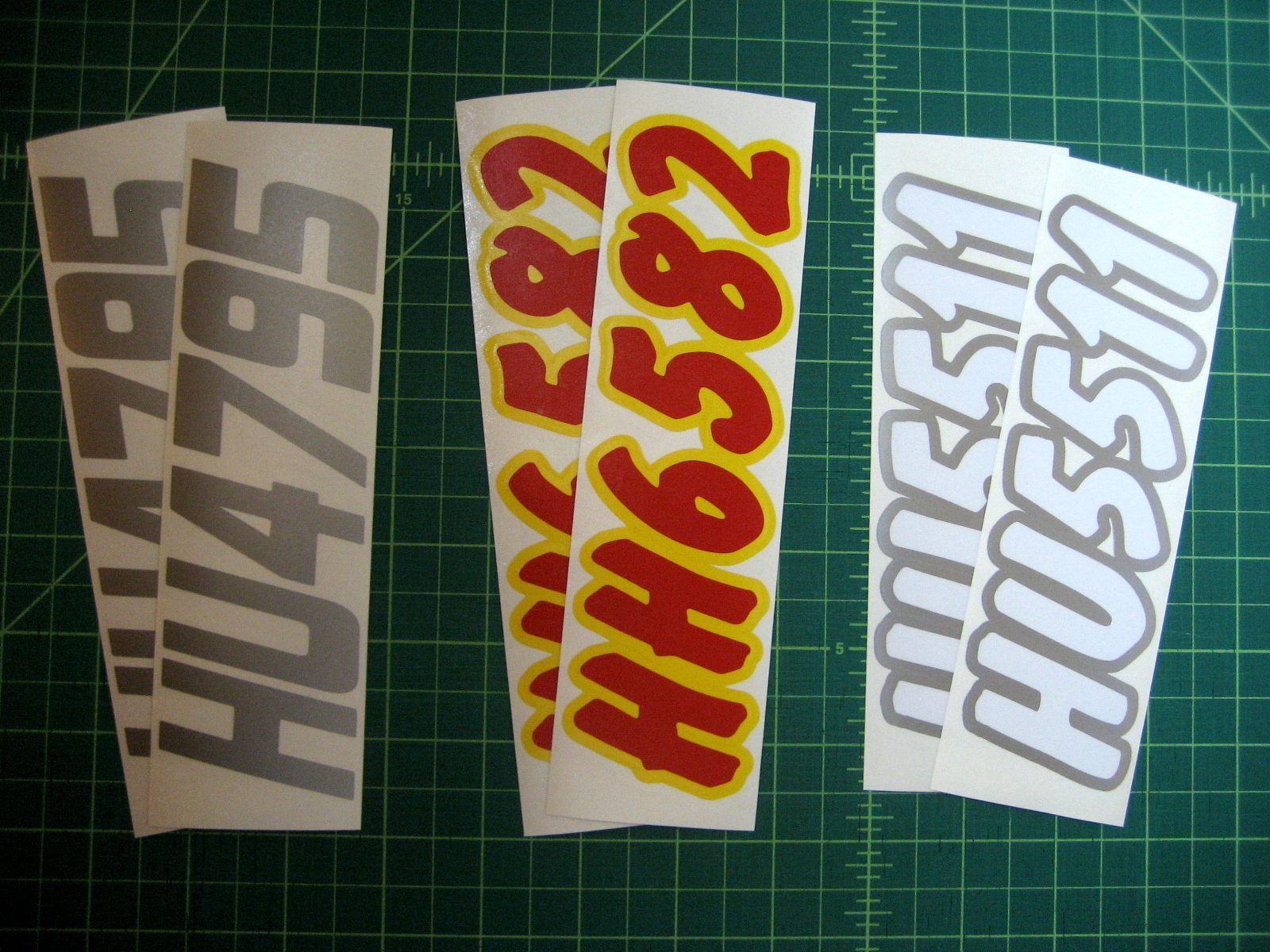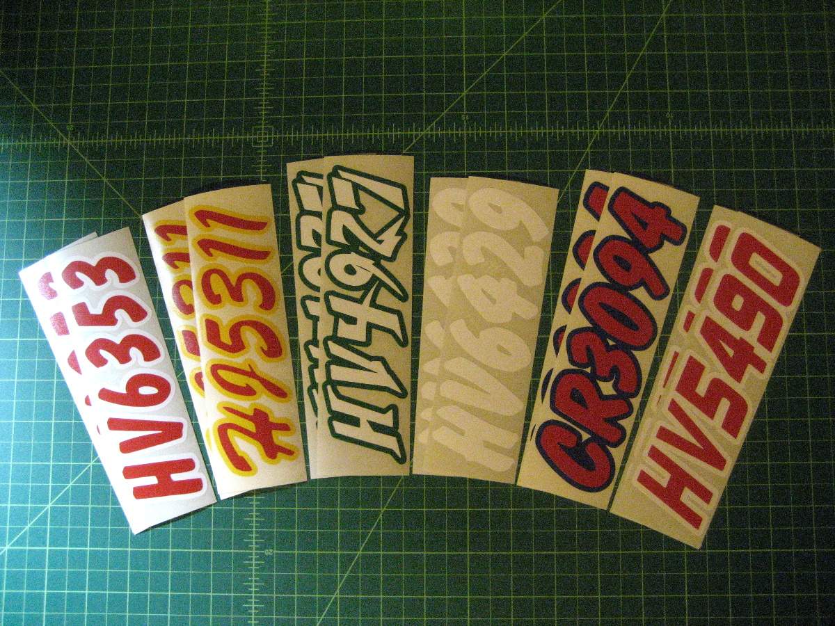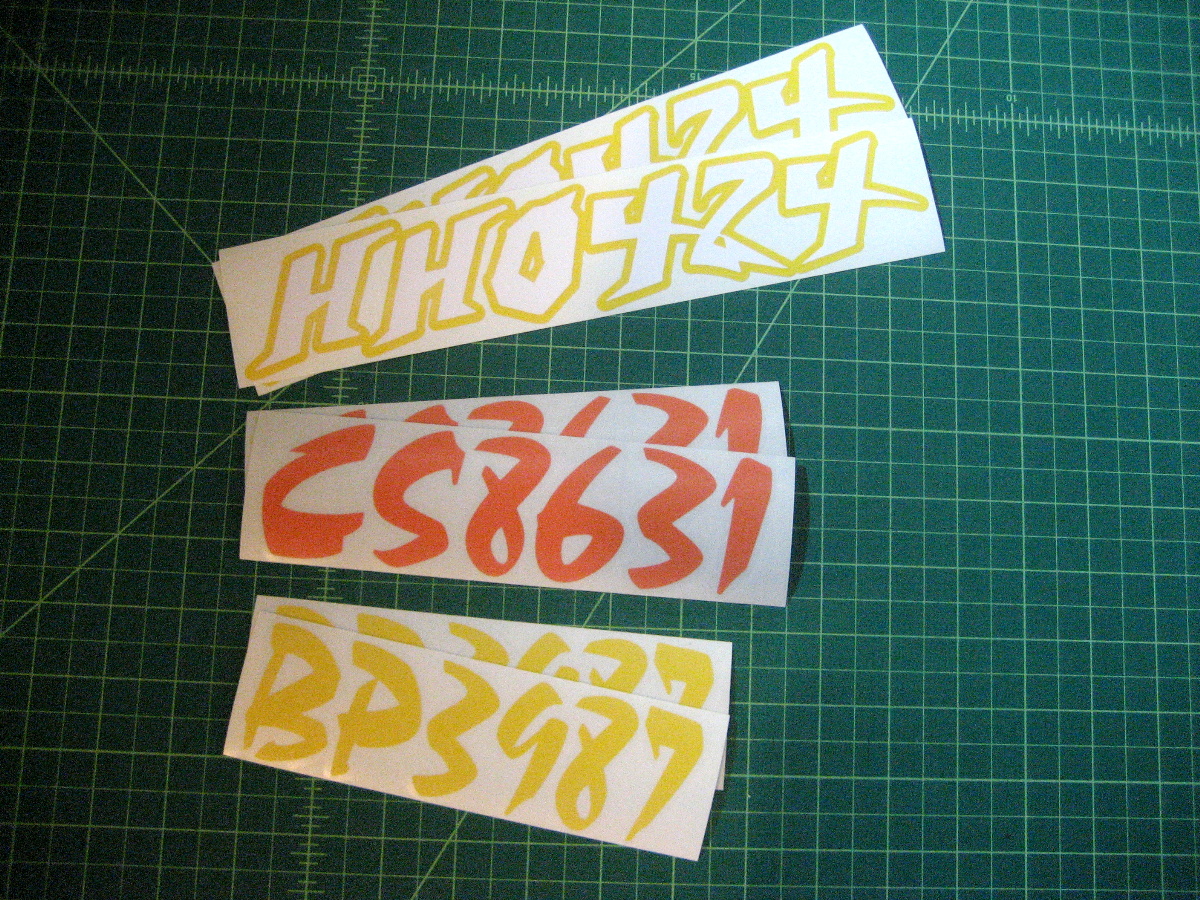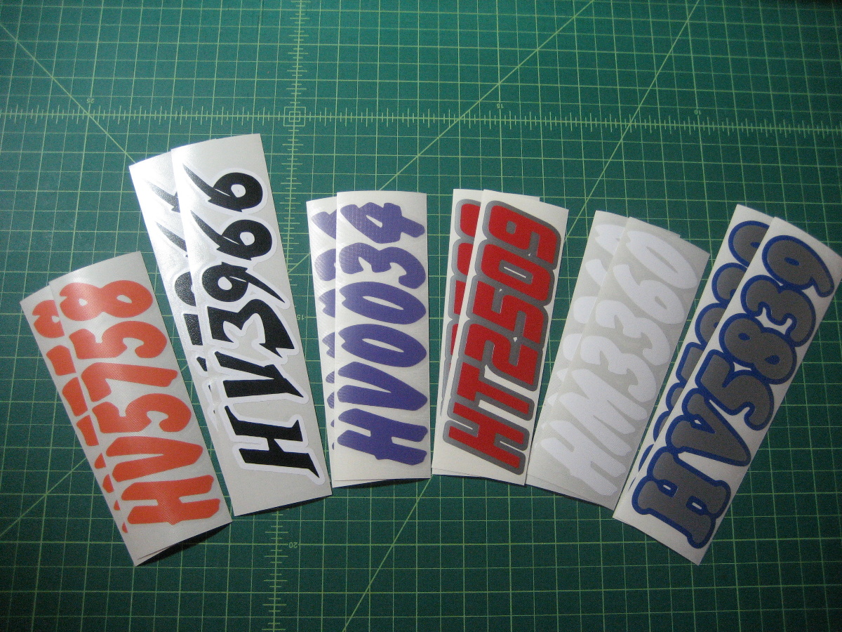 Just a few samples snowmobile registration numbers with and without outline options... (Note: the background color on some of the samples is for visual only)