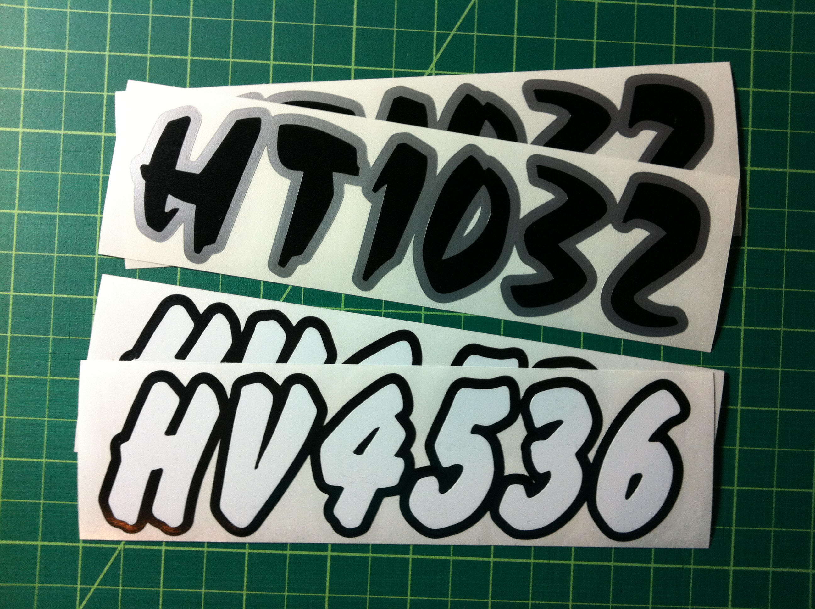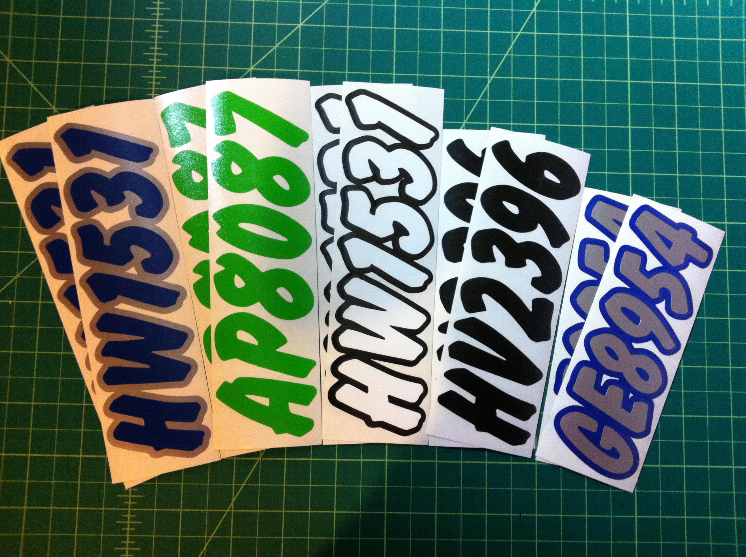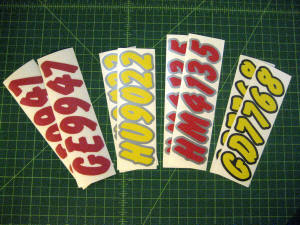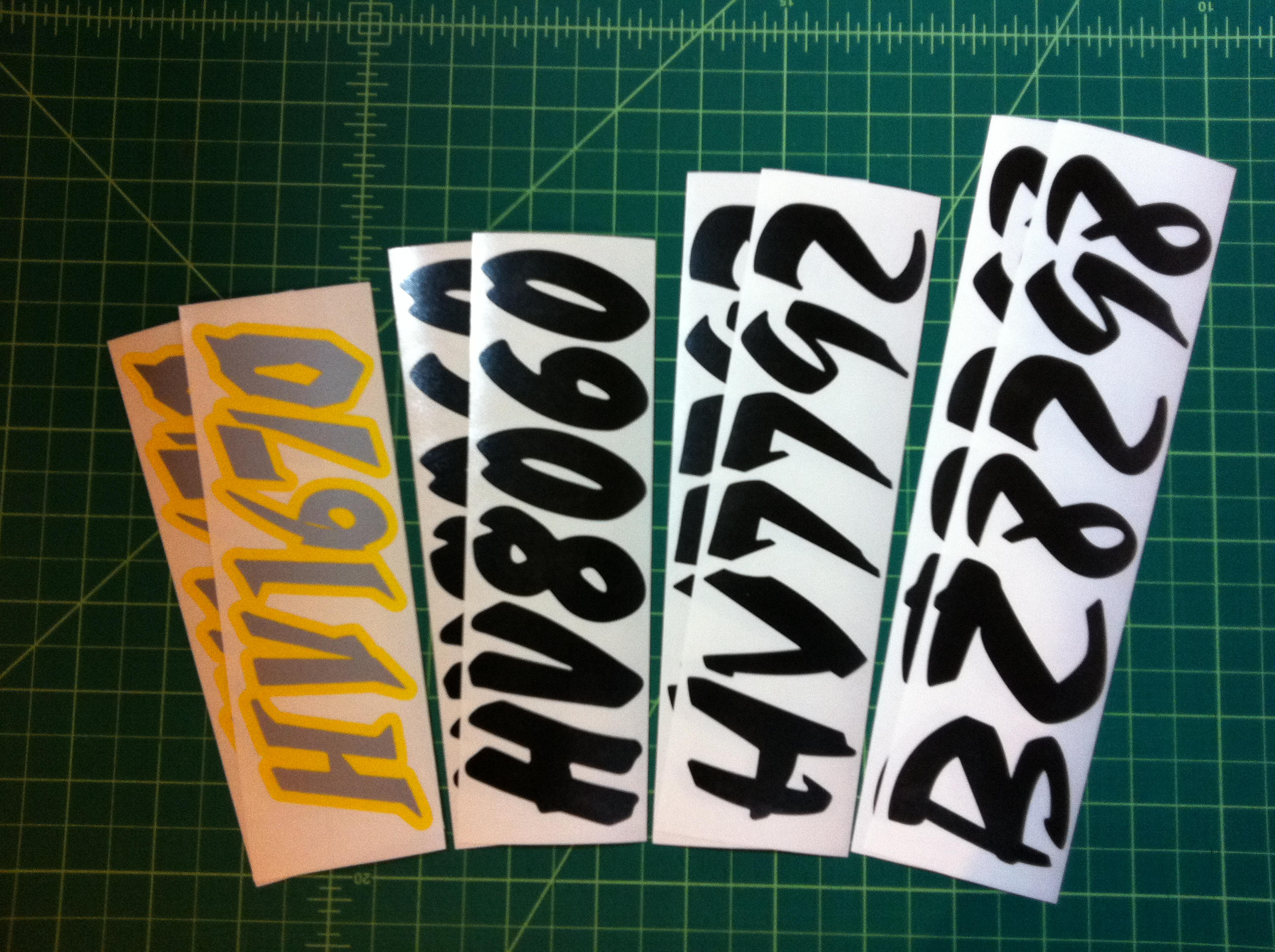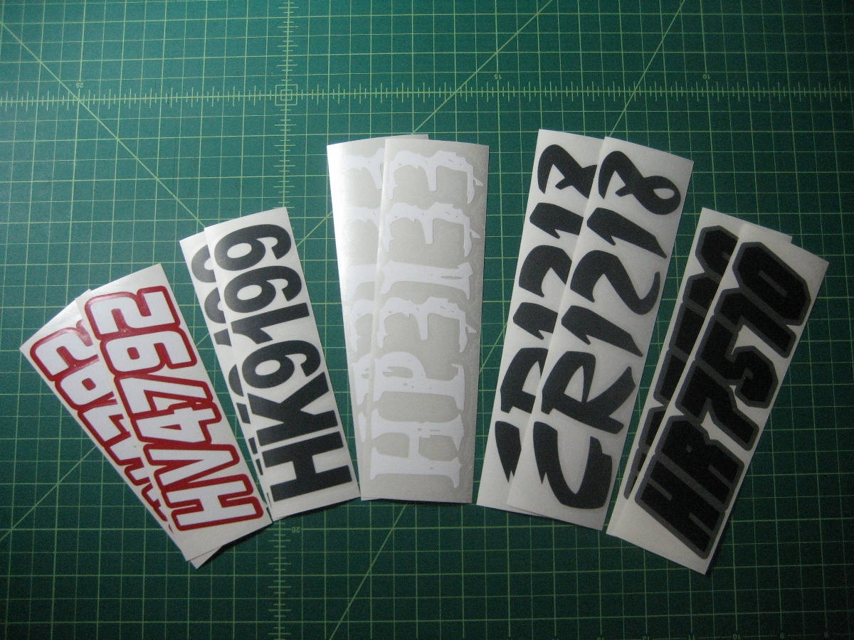 Just a few samples snowmobile registration numbers with and without outline options... (Note: the background color on some of the samples is for visual only)